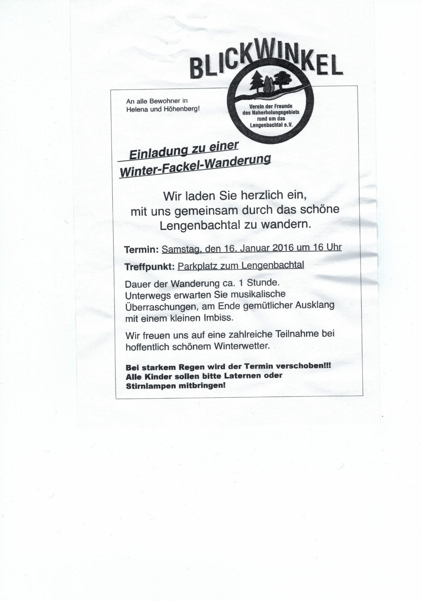 Am 16.01.2016 ab 16:00 Uhr möchten wir sie wieder einladen, mit uns eine Wanderung rund ums Lengenbachtal zu unternehmen. Unser Aktivkreis hat sich für Unterwegs ein paar Überraschungen einfallen lassen. Näheres können sie aus dem Flyer